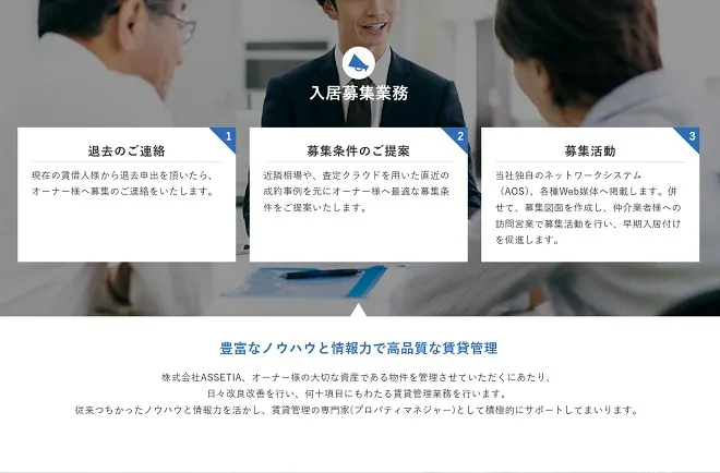 ①賃貸管理・サブリース: 賃貸経営の総合サポート。 ②賃貸仲介(お部屋探し): アパマンショップネットワークを活用した入居者募集。 ③不動産売買: 資産の売却・購入のサポート。 これらの特徴から、ASSETIAは不動産オーナーに対して、賃貸経営の安定化から資産価値向上まで、多角的な視点でサポートを提供する企業です。豊富なノウハウと情報力で高品質な賃貸管理