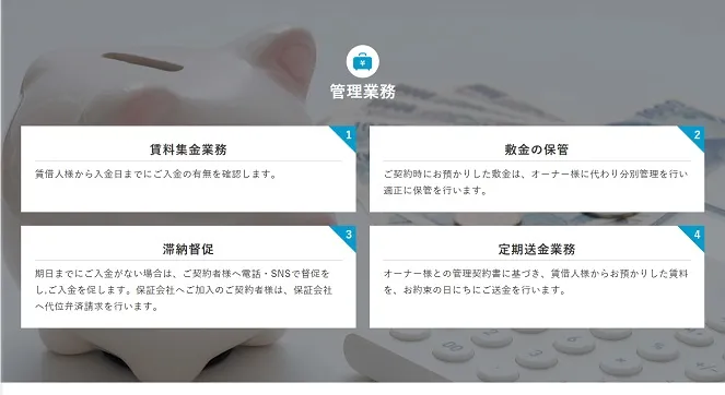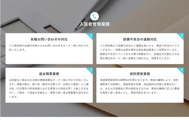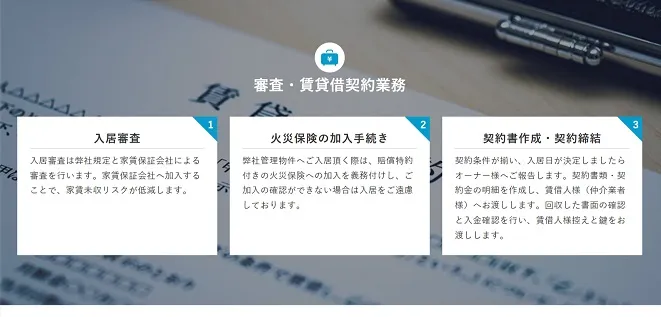 入居者募集(リーシング)、審査、契約代行、更新、退去、クレーム対応、滞納督促、建物保守、リフォームまで一貫して行います。
