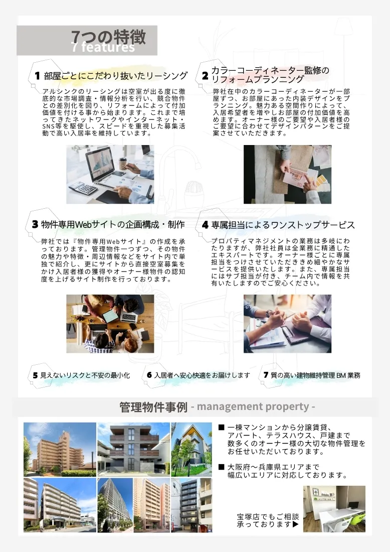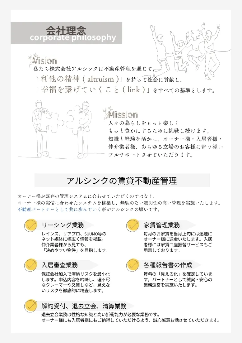 既存の管理システムに合わせて頂くのではなく、オーナー様の実情に合わせたシステムを構築し無駄のない透明性の高い管理を実施。 不動産パートナーとして共に歩んでいく事がアルシンクの願いです。